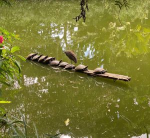 8. “Found this amazing sight: 9 turtles and a bird just chilling.”