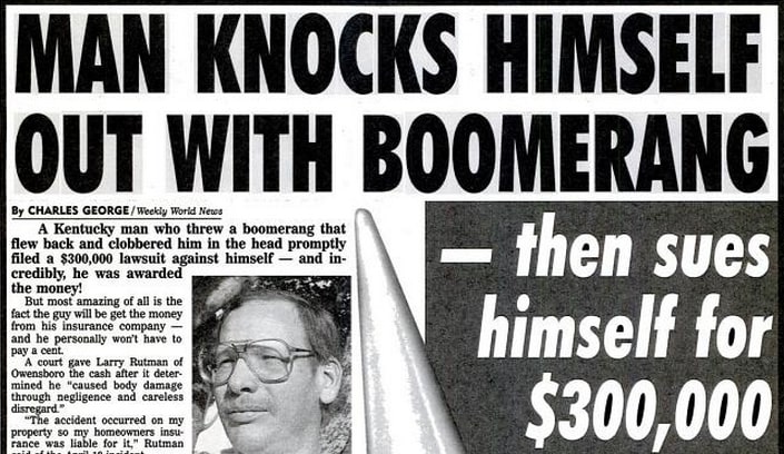 A Kentucky man sued himself for $300,000 for getting hit by a boomerang that he himself had thrown. The court awarded him the amount, and all of it was paid to him by his insurance company.