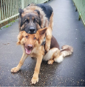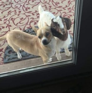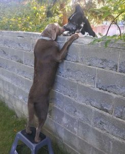 14. “Our neighbor sent me this picture of our dogs. They finally got him a stool so he could greet his big friend properly.”
