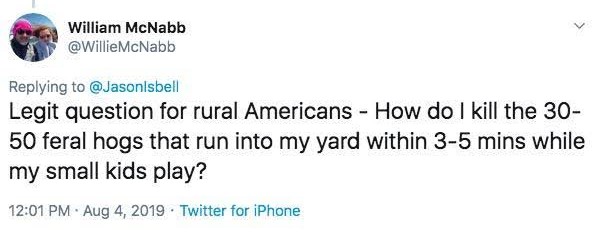 A pro-gun enthusiast from USA asked how is he supposed to kill 30-50 feral hogs within 3-5 minutes without an automatic rifle, if they storm his yard to attack his children.