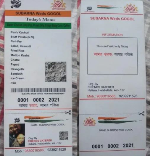 In place of the Aadhaar number, the digits read the wedding date of the couple, which was 1st February 2021. The menu also mentioned the name of the caterer in the Aadhaar card’s address section.