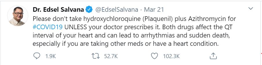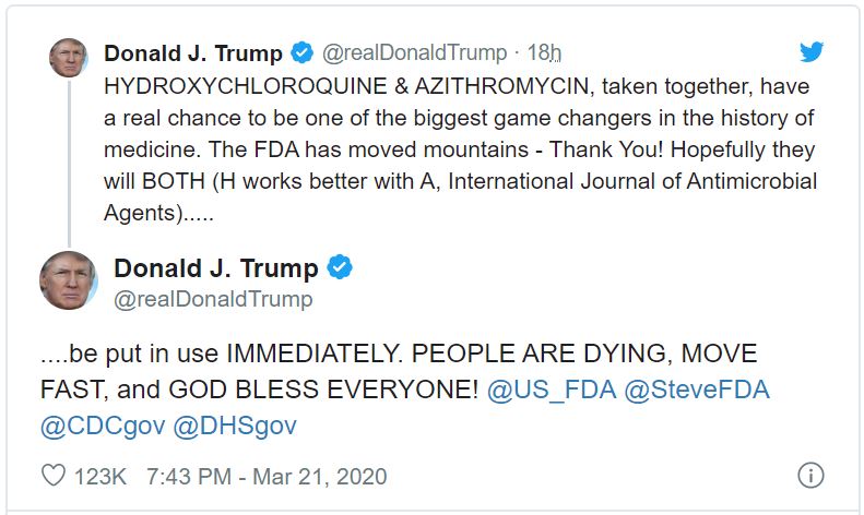 On the other hand, Donald Trump went so far as to go to the White House briefing where he falsely claimed that this combination of Azithromycin and Chloroquine has been approved.