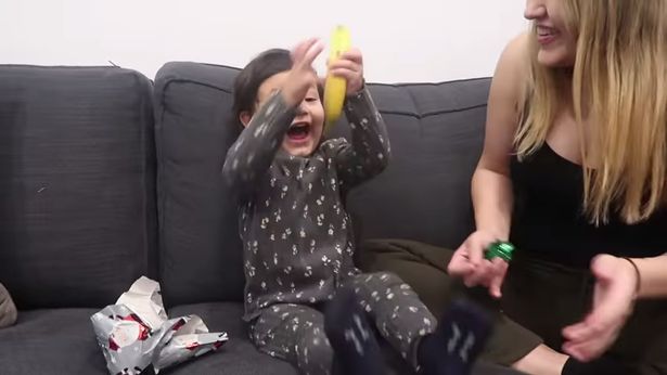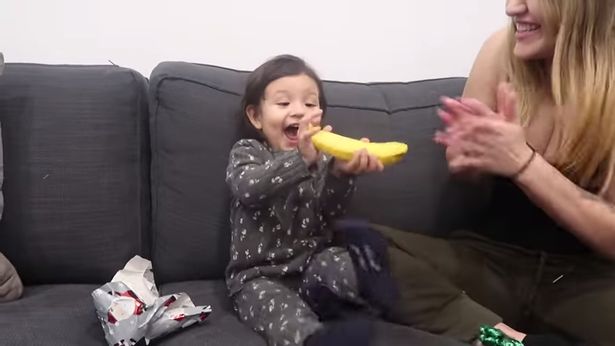 She quickly unwrapped it, saw the banana which was the prank gift, and shrieked in delight.
