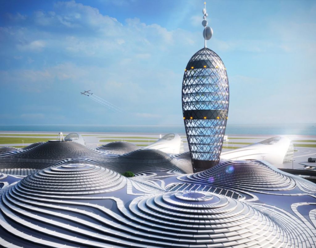 Named as the Spaceport City, this four-storied spaceport has the most unique design as its cylindrical glass towers rise from a floating island that hangs over the water.