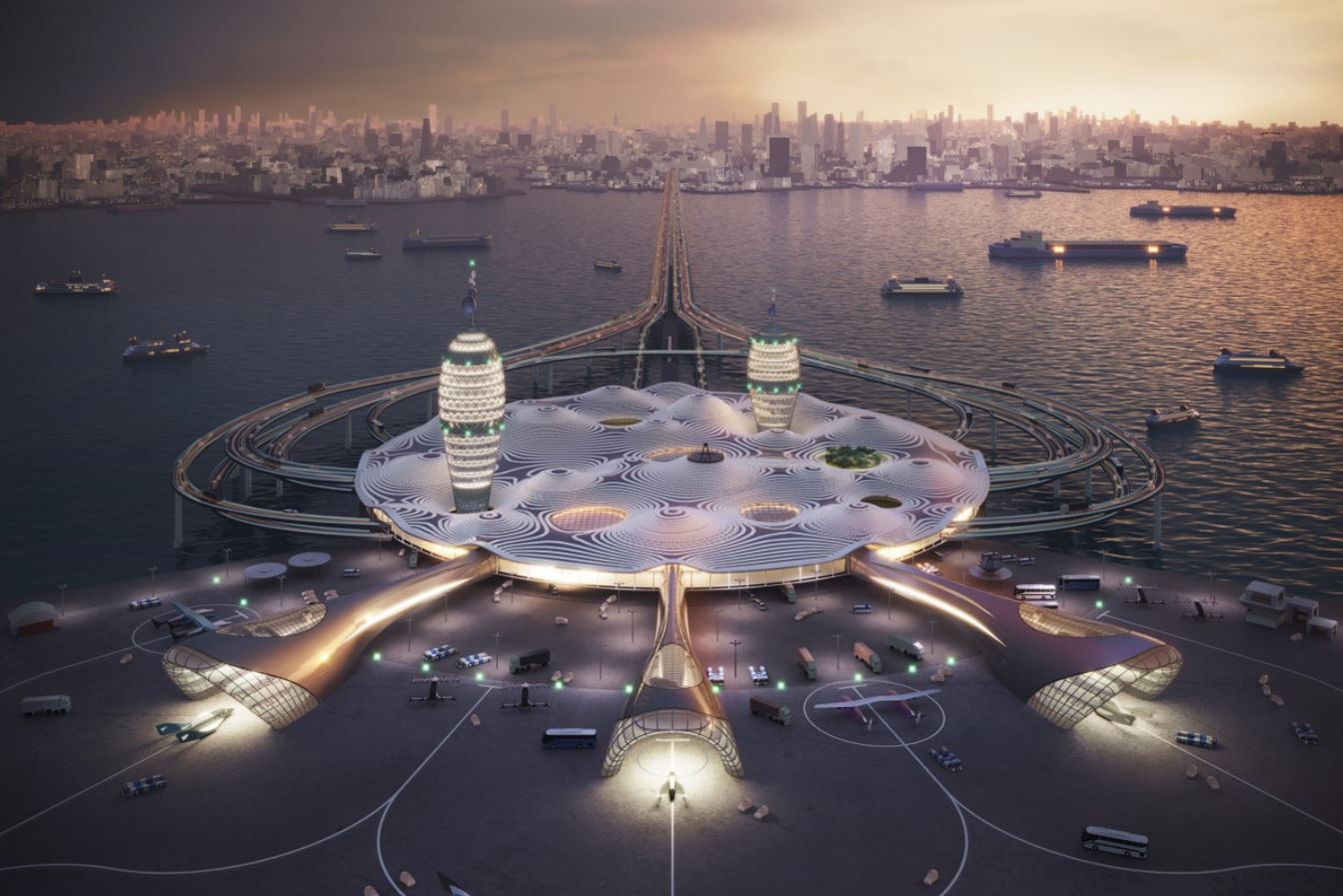 The floating island of Spaceport City will be connected to the city via a network of public transport, electric car bridges, and automatic trains.