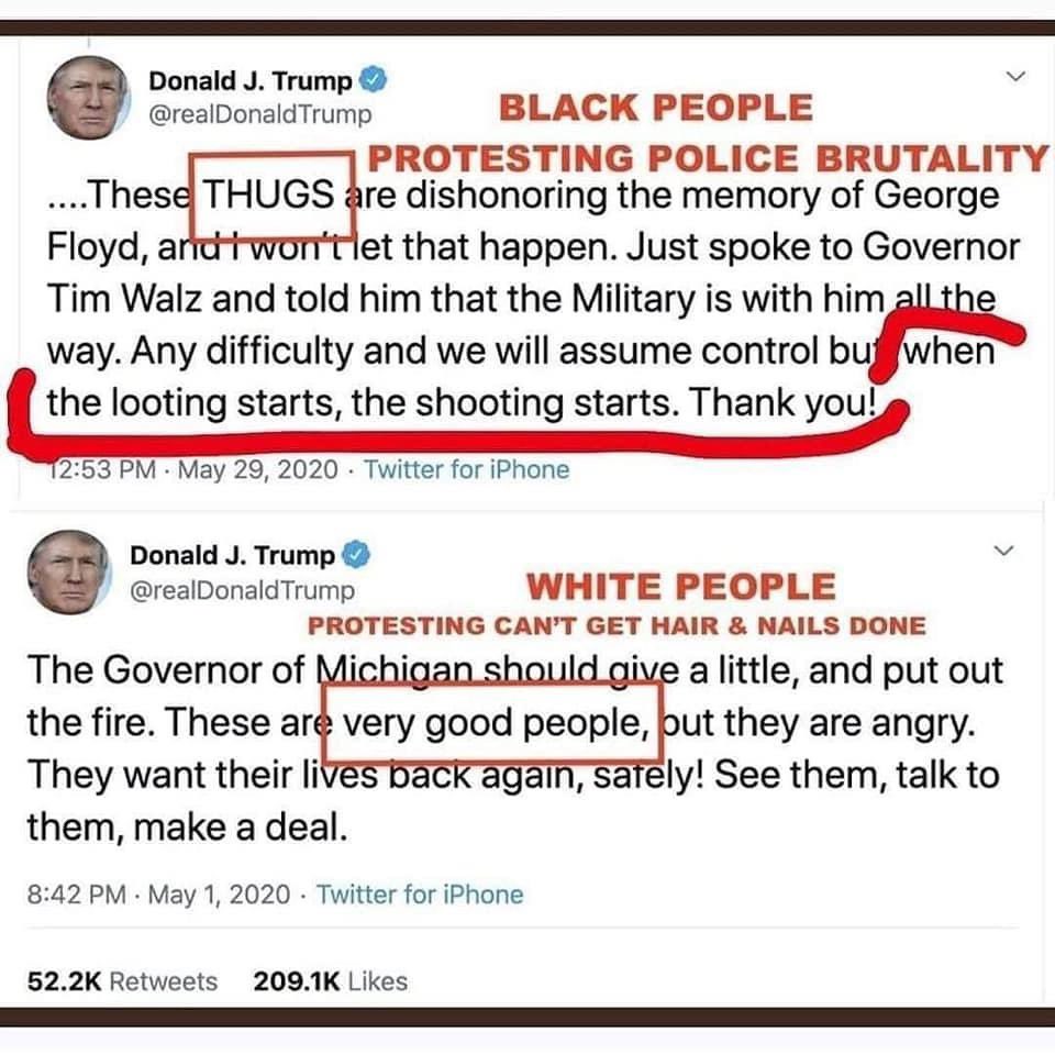 Trump has not failed to show his open hatred for black people. He did it when he called Black protestors as “THUGS” and threatened to shoot them, while he said that the white protestors with weapons whining about haircuts were “very fine people” and they “just wanted their lives back.”